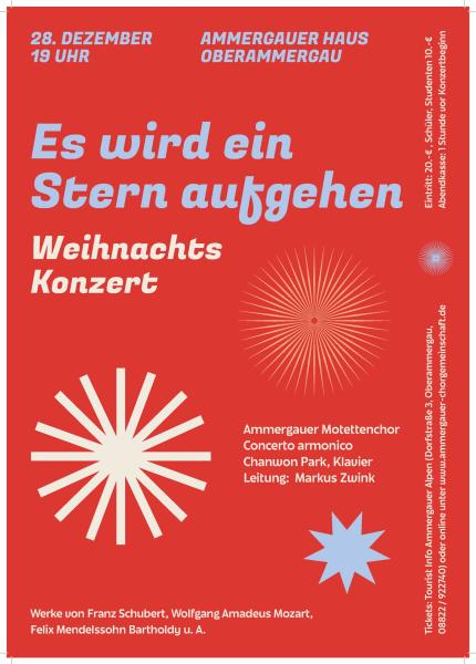 Unter dem stimmungsvollen Motto „Es wird ein Stern aufgehen“ lädt der Ammergauer Motettenchor unter Leitung von Markus Zwink zum diesjährigen Weihnachtskonzert am Sonntag, den 28. Dezember um 19.00 ins Ammergauer Haus ein. Virtuose Orchestermusik dominiert den ersten Teil, klangvolle Chormusik den zweiten Teil dieses Konzerts, bei dem jeder Klassikfan auf seine Kosten kommen sollte.